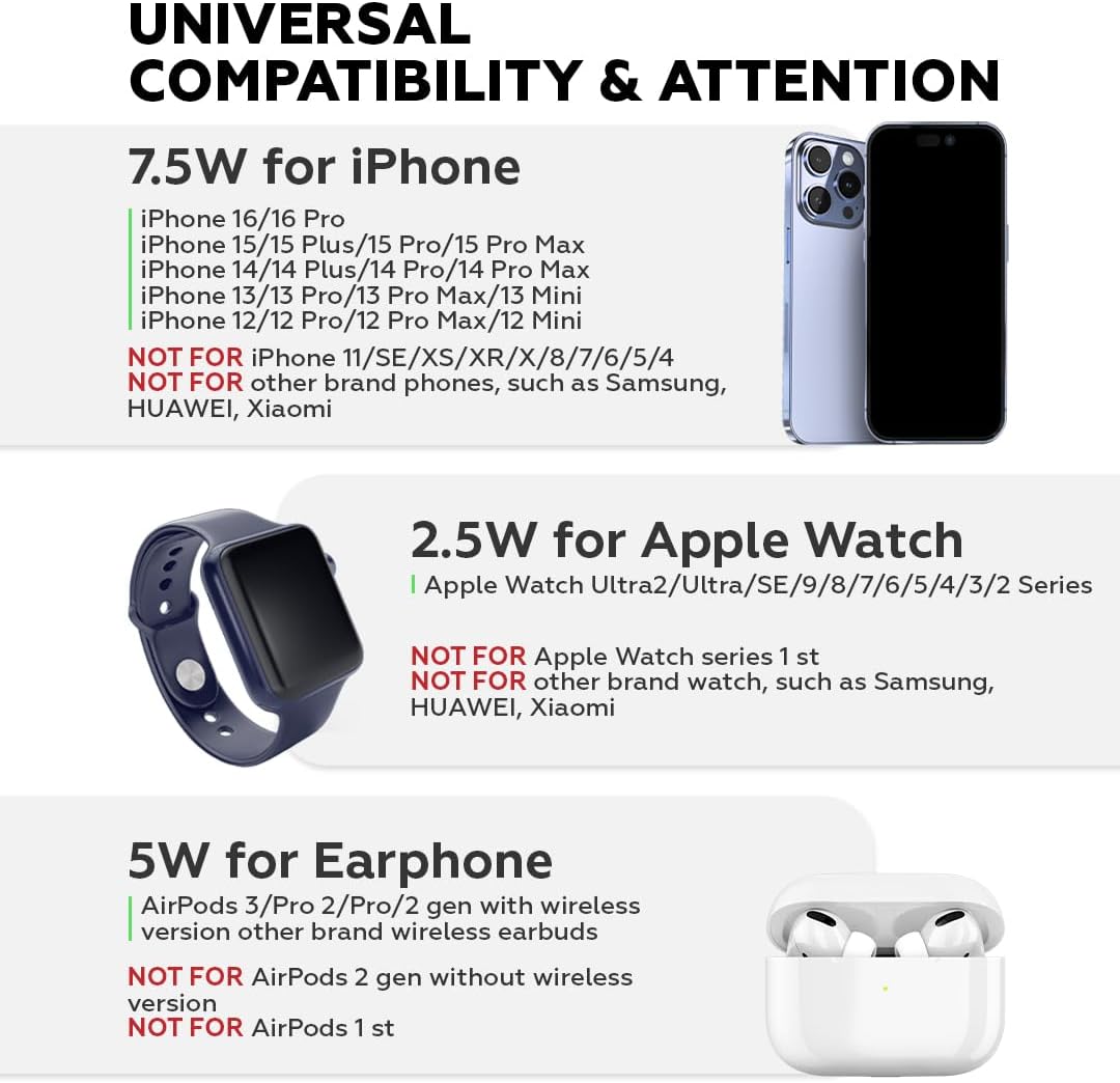 Charge your phone, Apple Watch, and AirPods all at once! This versatile wireless charger is compatible with AirPods 2/3, AirPods Pro/Pro 2, and Apple Watch Series 6/5/4/3/2/SE.